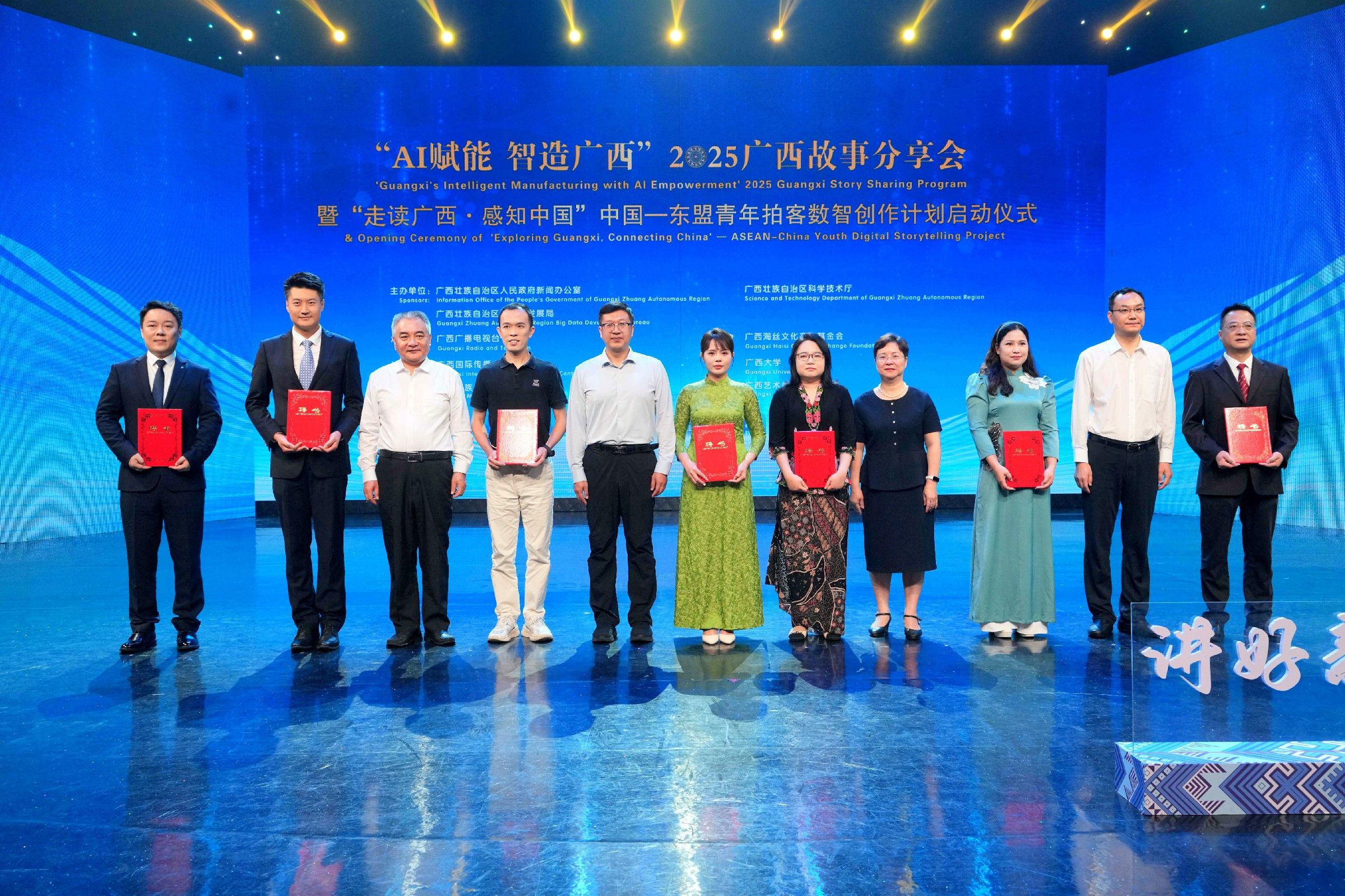 Recently, the 2025 Guangxi Story Sharing Conference themed “AI Empowerment: Intelligent Manufacturing in Guangxi” and  Opening Ceremony of the “Exploring Guangxi, Connecting China” China-ASEAN Youth Digital Storytelling Project were held in Nanning. Nguyen Mai Duc, a Ph.D student majoring in Industrial Economics at our School, as an outstanding international student representative, vividly shared the facilitation of cross-border processes brought by the development of China’s smart logistics. It demonstrated outstanding contributions of the School in cultivating international talents and serving China-ASEAN cooperation.