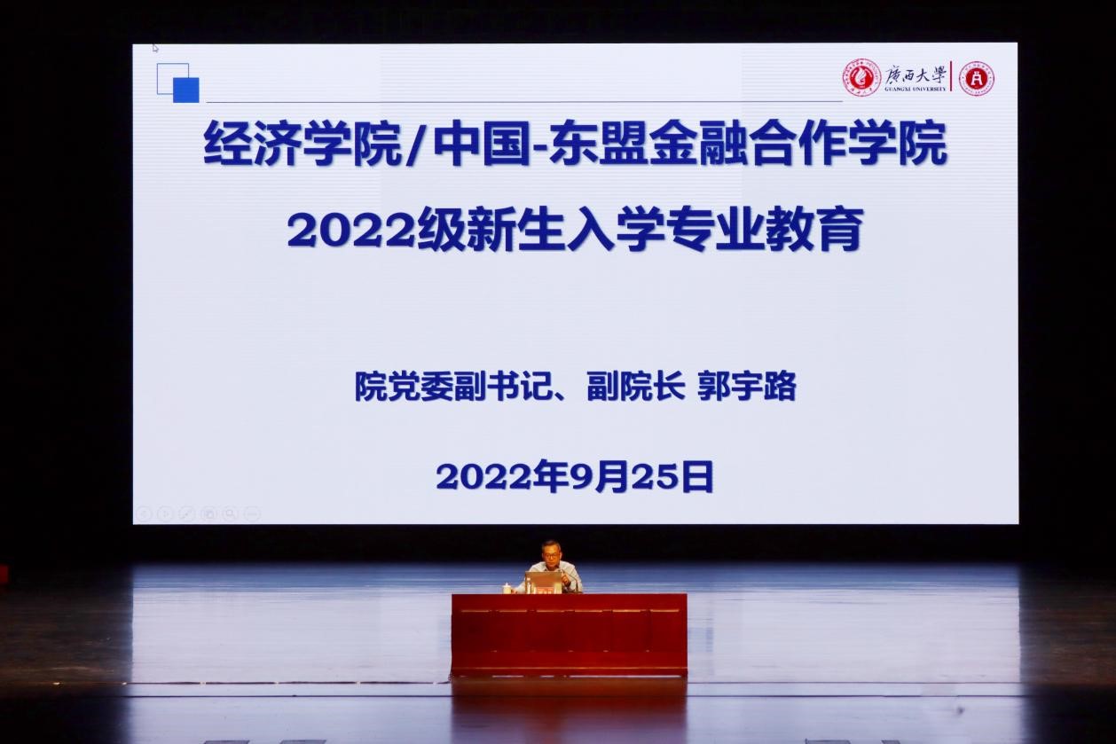 /中国-东盟金融合作学院党委副书记、副院长郭宇路在汇学堂为2022级本科新生做学科专业和学籍管理教育讲座。