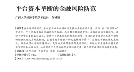 /中国-东盟金融合作学院何诚颖教授的论文《平台资本垄断的金融风险防范》正式发表于人民论坛·学术前沿(2023年第16期)。作者分析了数字经济时代平台资本垄断泛金融化的态势,厘清了平台资本垄断基本涵义,聚焦了平台资本发展的特性和趋势,认识了平台资本发展中面临的金融风险及其形成机理,并提出了相关政策建议。