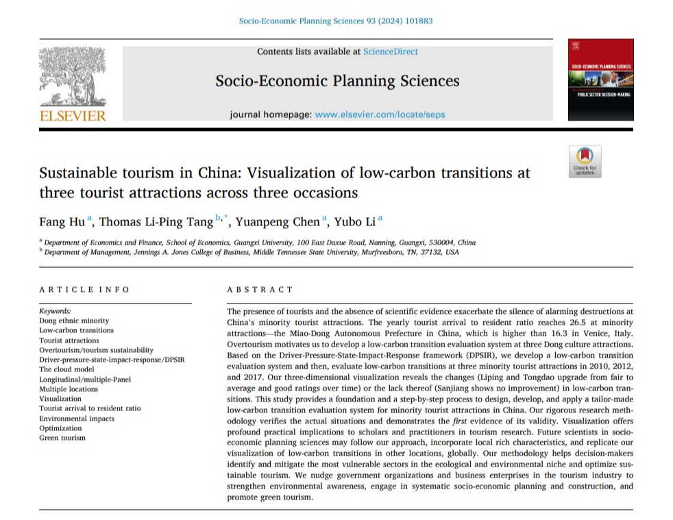 胡芳老师作为第一作者与硕士研究生陈渊鹏和李誉博、美国中田纳西州立大学Thomas Li-Ping Tang教授共同完成的学术论文“Sustainable Tourism in China: Visualization of Low-Carbon Transitions at Three Tourist Attractions across Three Occasions”(《中国的可持续旅游:三个旅游景点在三个时期的低碳转型可视化》)在经济学领域国际权威期刊Socio-Economic Planning Sciences在线发表。该研究得到国家自然科学基金委和性吧