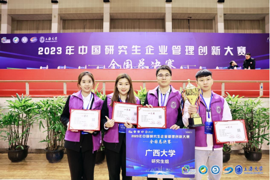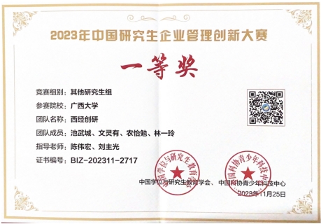 师生力争上游,由池武城、文灵有、农怡勉、林一玲组成的“西经创研”代表队,在陈伟宏、刘主光等老师的指导下脱颖而出,成功晋级全国总决赛并获得了赛事最高奖项全国一等奖,另有一个团队获得全国二等奖、三个团队获得全国三等奖。