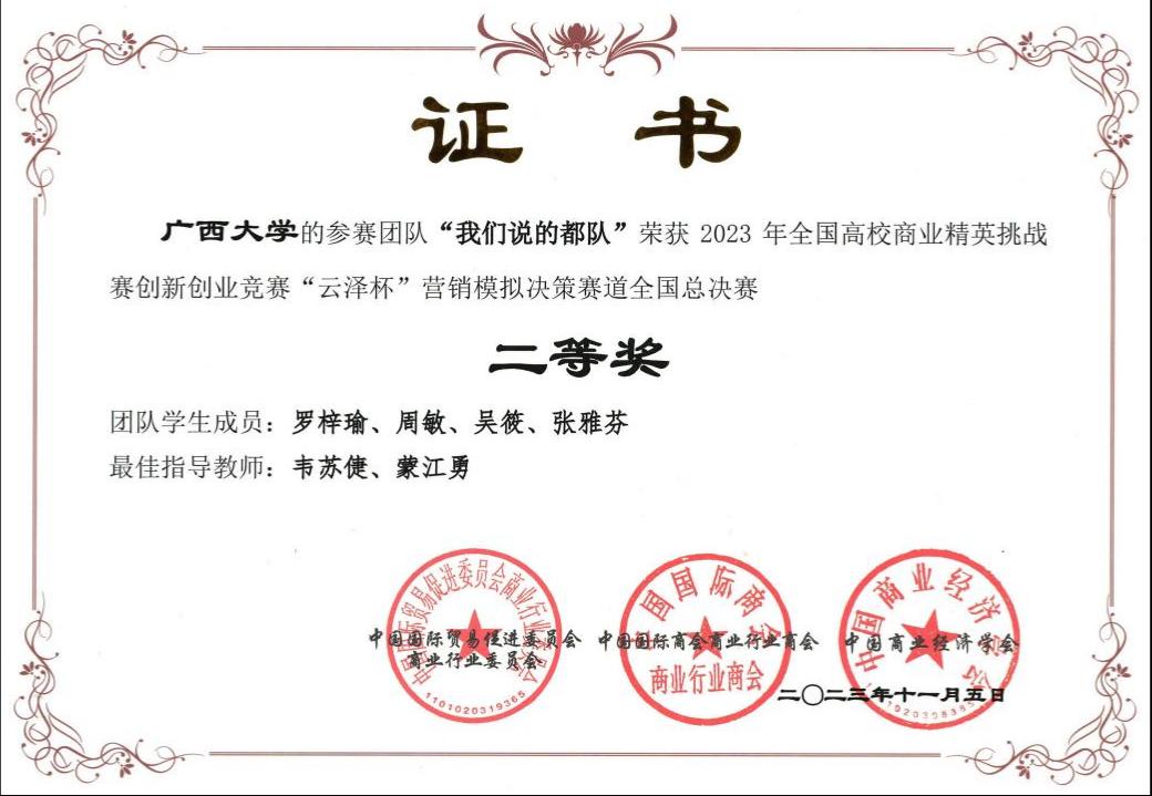 近日,2023年全国高校商业精英挑战赛创新创业竞赛“云泽杯”营销模拟决策赛道全国总决赛落下帷幕。该赛项从校赛到全国总决赛共计2000多支队伍参赛,在全国预选赛中,性吧
