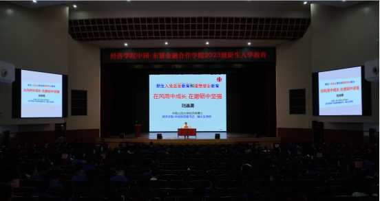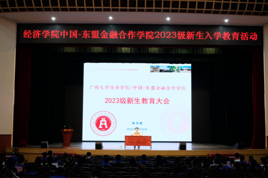 /中国-东盟金融合作学院在学校大礼堂开展2023级新生入党启发、理想信念、廉洁清正、安全纪律文明等系列入学教育活动。院党委书记陆善勇、副书记陈卉娟、团委书记王海希,学工组全体辅导员和性吧