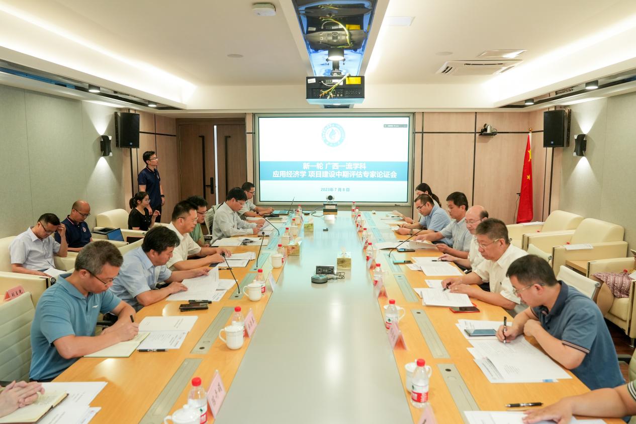 学科负责人李光辉院长向专家组汇报了《应用经济学学科实施广西一流学科项目建设中期评估自评报告》。专家组围绕项目建设进展情况、项目资金使用情况、存在问题、改进思路与举措等进行了深度研讨和交流,对应用经济学学科的建设提出了针对性、建设性的意见建议。经充分质询及讨论,专家组一致认为,应用经济学科全面完成了新一轮广西一流学科项目建设中期任务,对建设成效及中期自评工作给予高度肯定,并建议自治区和学校加大对应用经济学科的经费和政策支持力度,进一步加强师资队伍和特色研究团队建设,力争在国家级科研项目、一流课程和教材建设、"东盟、边疆经济"特色研究成果等方面取得更大突破。