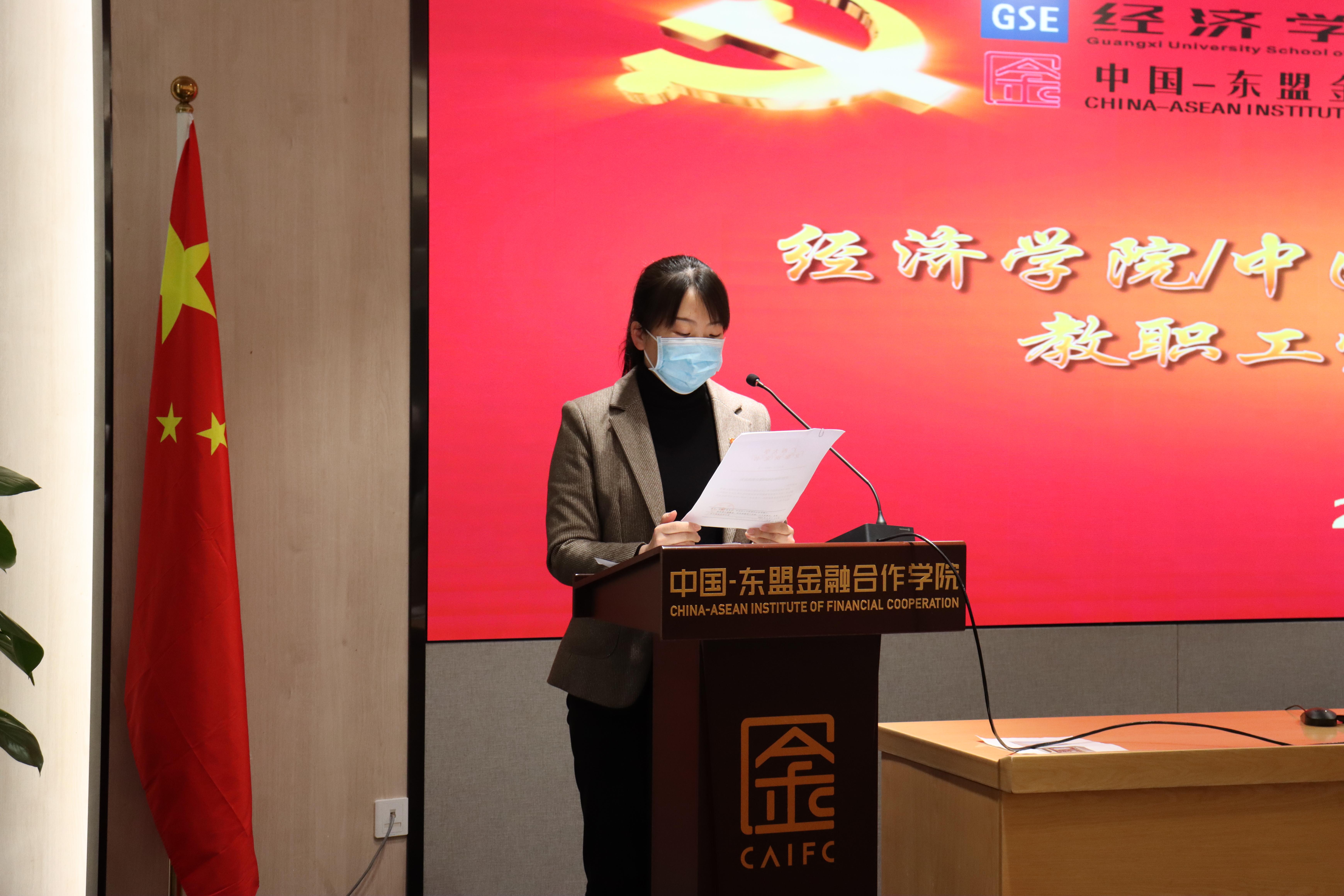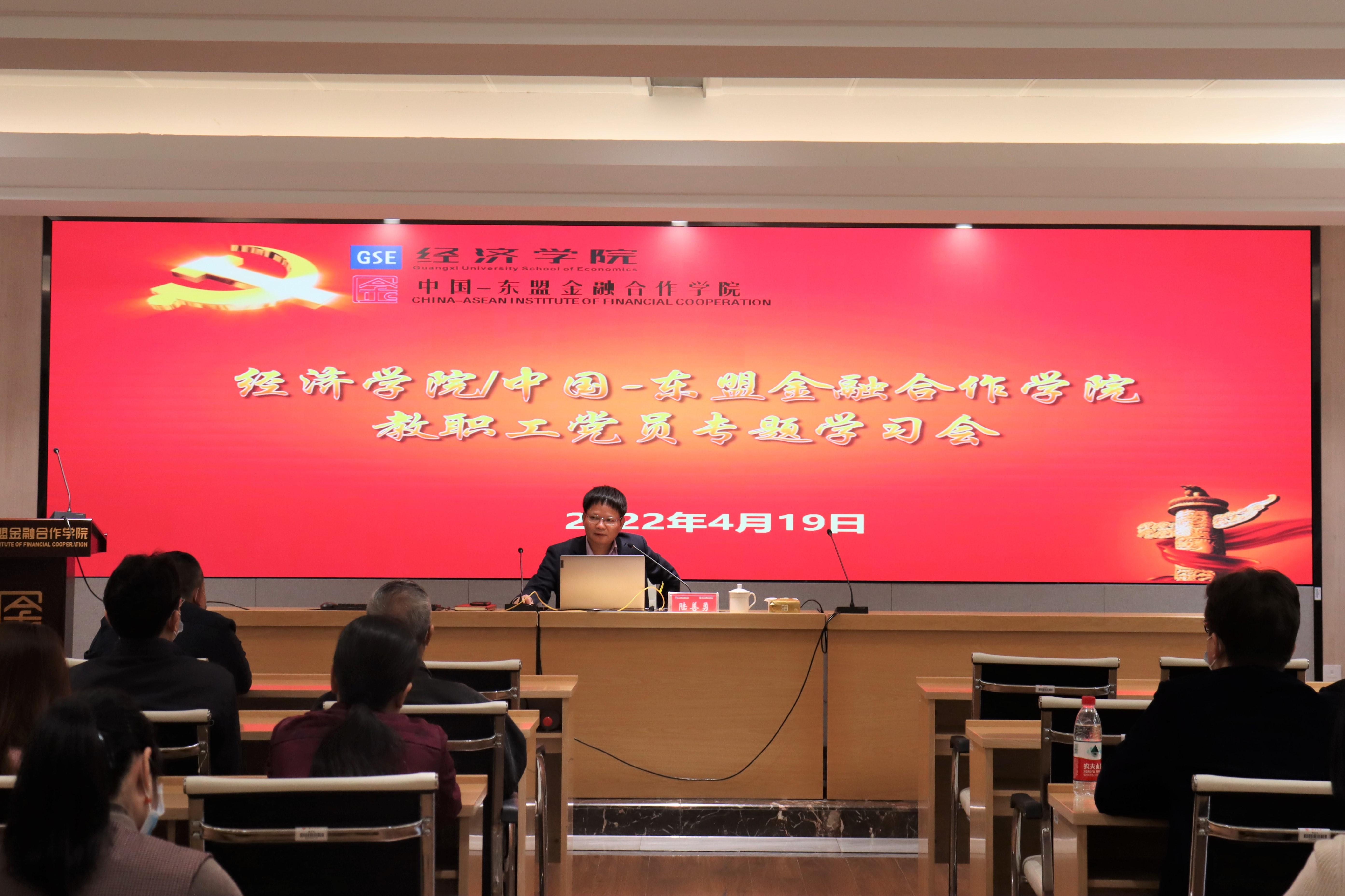/中国-东盟金融合作学院党委在101会议室召开全院教职工党员专题学习会,院党委书记陆善勇教授主持会议。