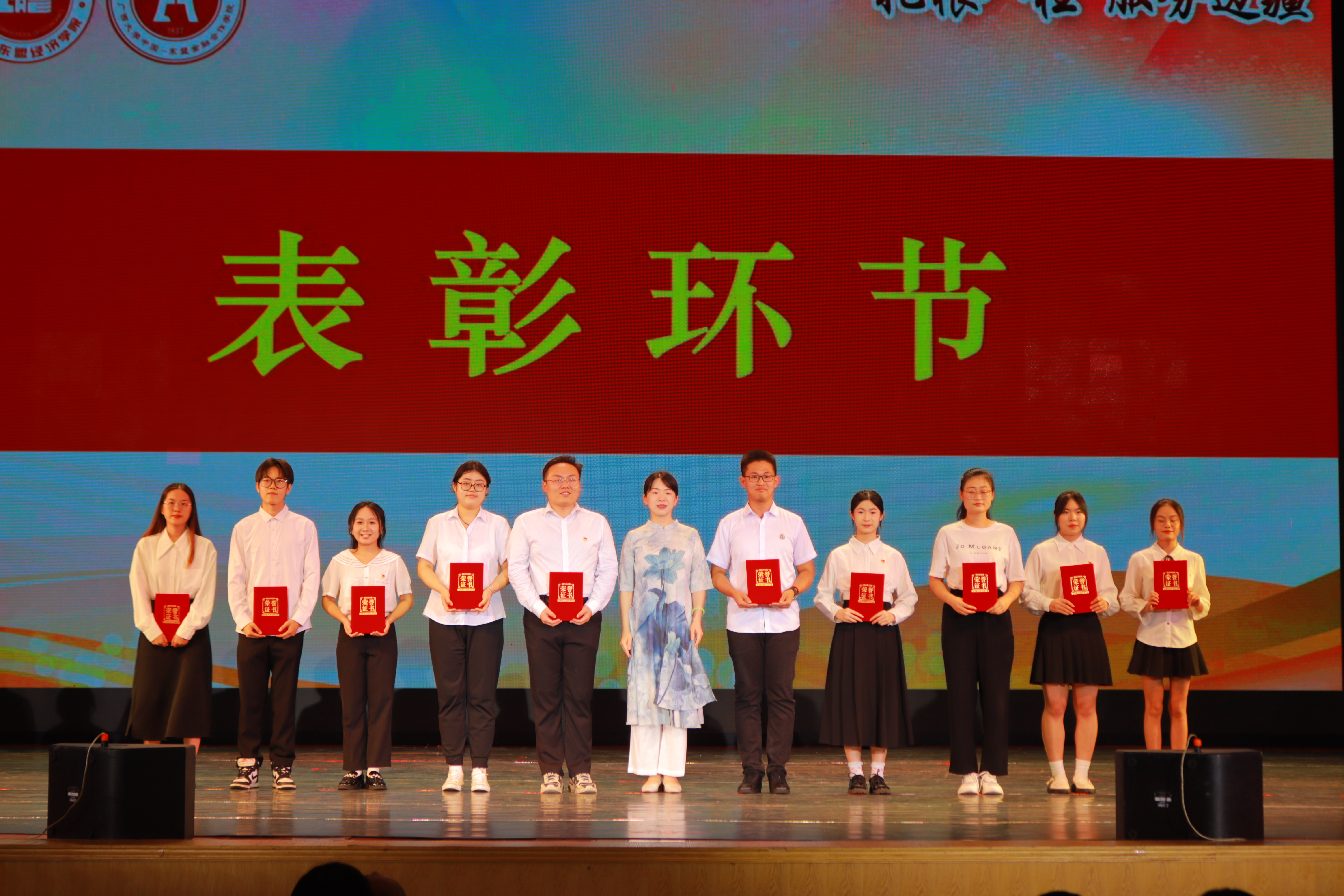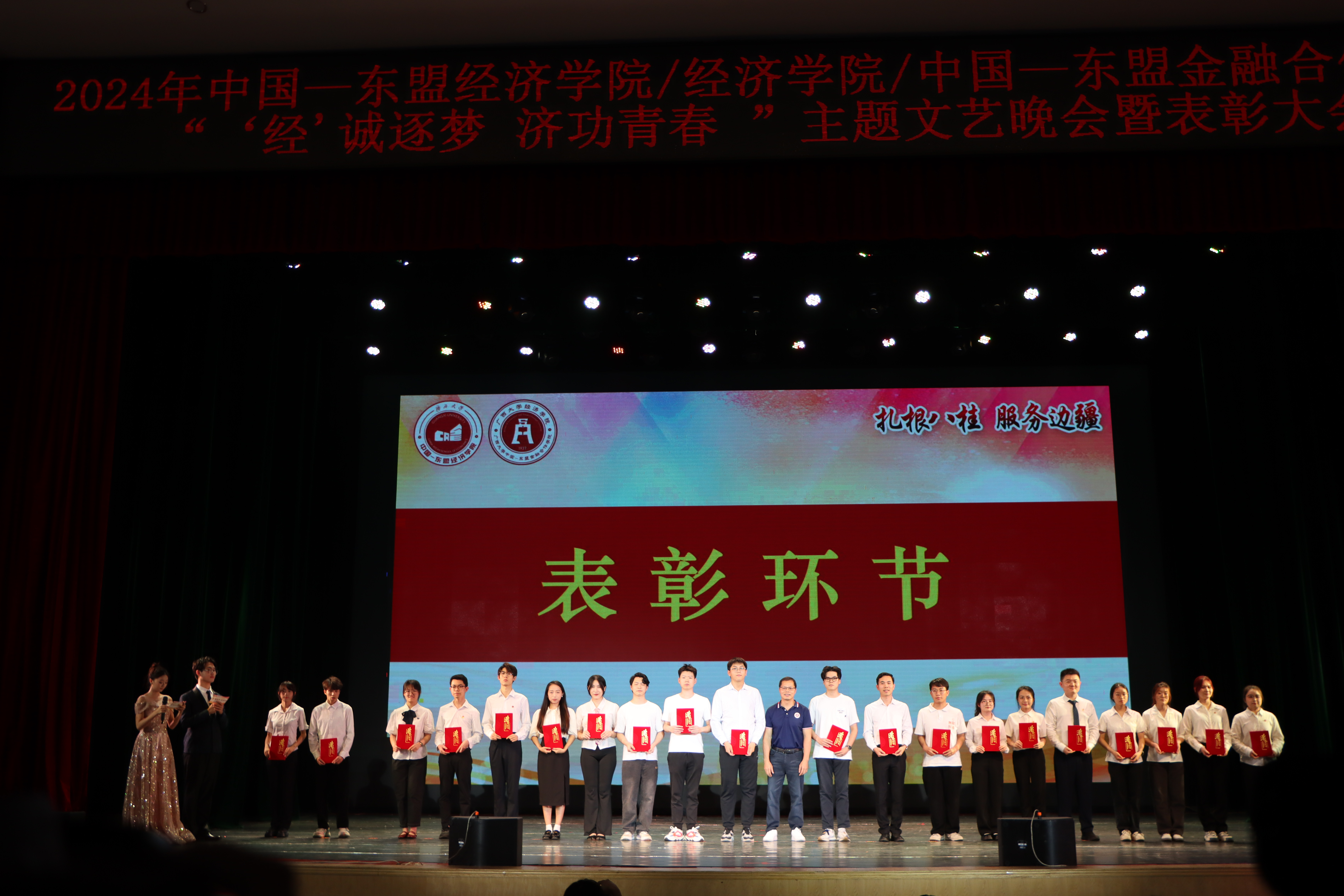 /中国—东盟金融合作学院2024年“‘经’诚逐梦,济功青春”主题文艺晚会暨表彰大会在学校大礼堂顺利举行。学院党委常务副书记罗诚、党委副书记陈卉娟、副院长梁权熙、学工组全体辅导员和学院部分教师出席活动。
