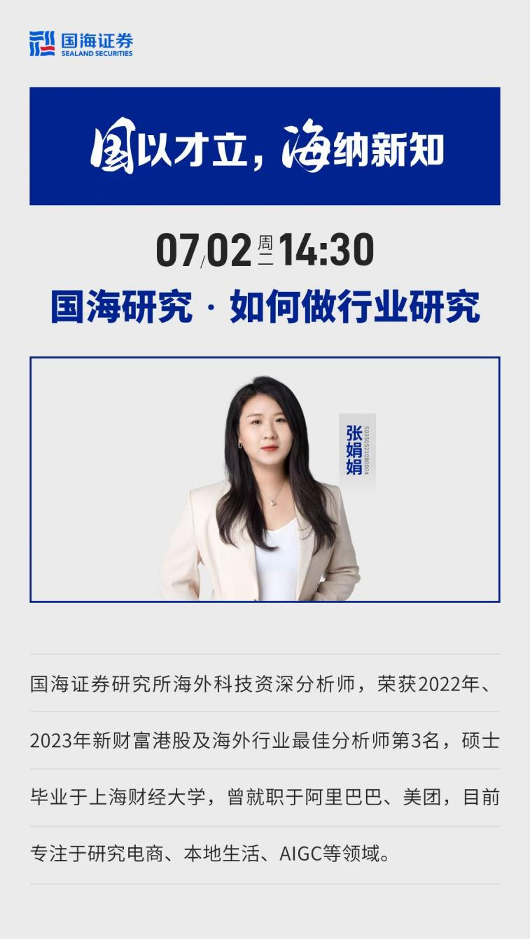张娟娟,国海证券研究所海外科技资深分析师,荣获2022年、2023年新财富港股及海外行业最佳分析师第3名,硕士毕业于上海财经大学,曾就职于阿里巴巴、美团,目前专注于研究电商、本地生活、AIGC等领域。
