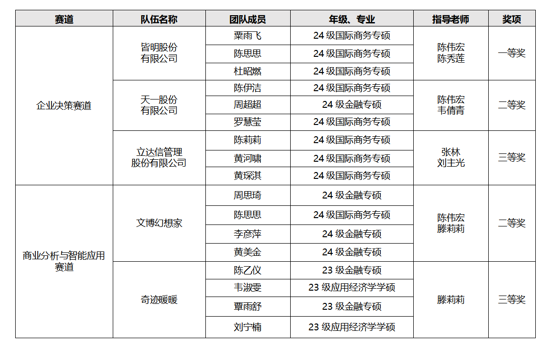 参赛选手在全国初赛、复赛中一路过关斩将,最终在总决赛中表现优异、力压群雄,一共斩获企业决策赛道全国一等奖1项(赛事最高奖项)、二等奖1项、三等奖1项;商业分析与智能应用赛道全国二等奖1项、三等奖1项。其中,企业决策赛道全国一等奖由陈伟宏、陈秀莲老师指导的性吧