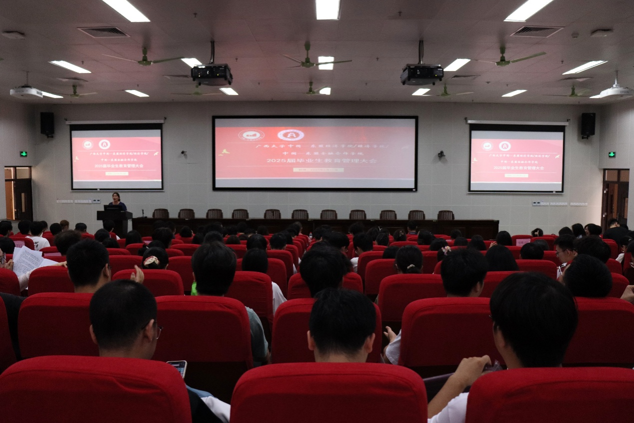 /中国—东盟金融合作学院在东校园六教第一阶梯教室召开2025届毕业生大会暨毕业生党员专题教育会。院党委常务副书记姜玮、党委副书记刘梦娟等学院领导及全体毕业生参会,会议聚焦党性教育、爱校荣校、征兵动员、毕业手续办理及反诈宣传等关键环节,为毕业生上好离校“最后一课”。