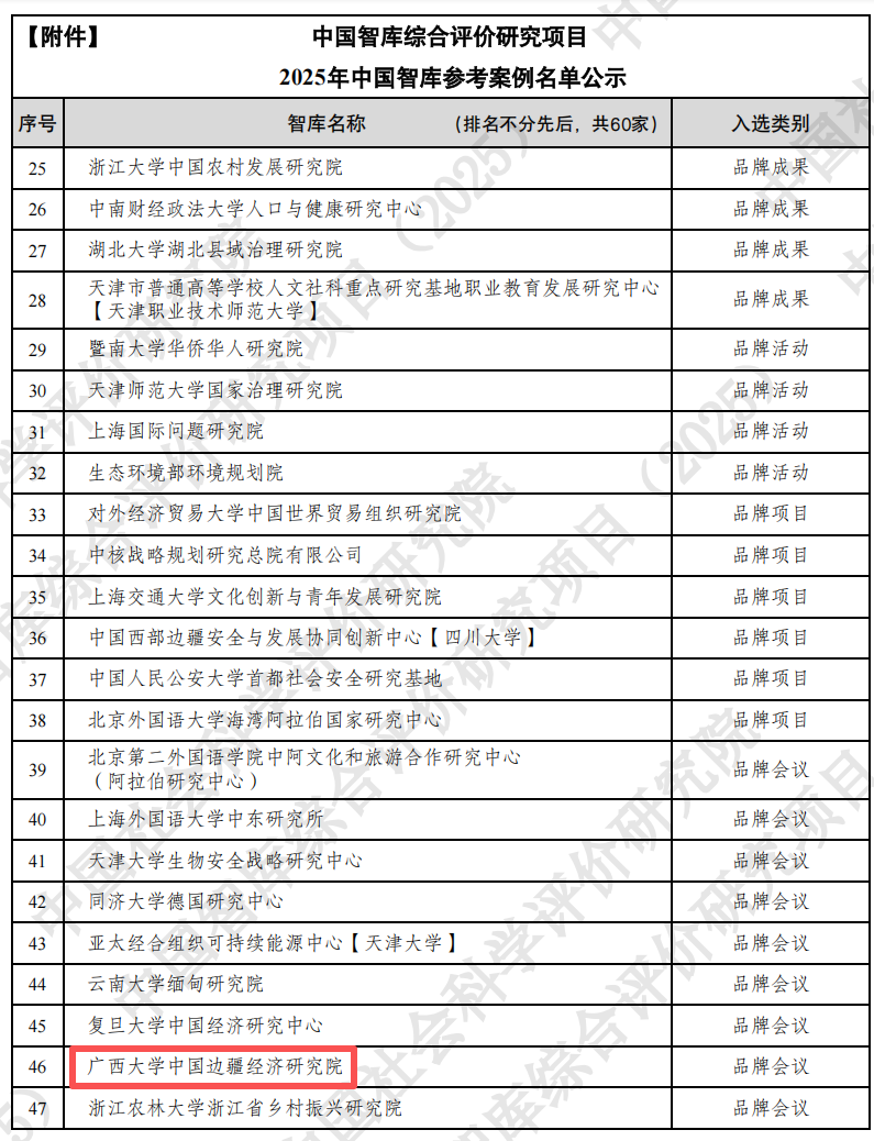 2025年7月,中国边疆经济研究院入选2025年AMI智库;2025年8月,中国边疆经济研究院品牌年度论坛“中国边疆经济开放发展论坛”入选2025年中国智库参考案例,全面展现了边疆院在科研创新与会议组织上的综合实力,这既是性吧