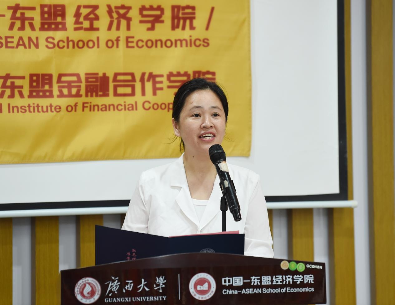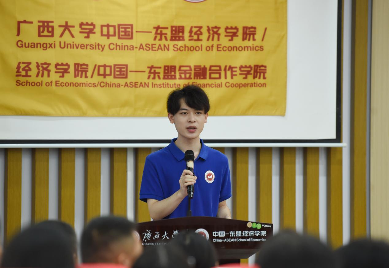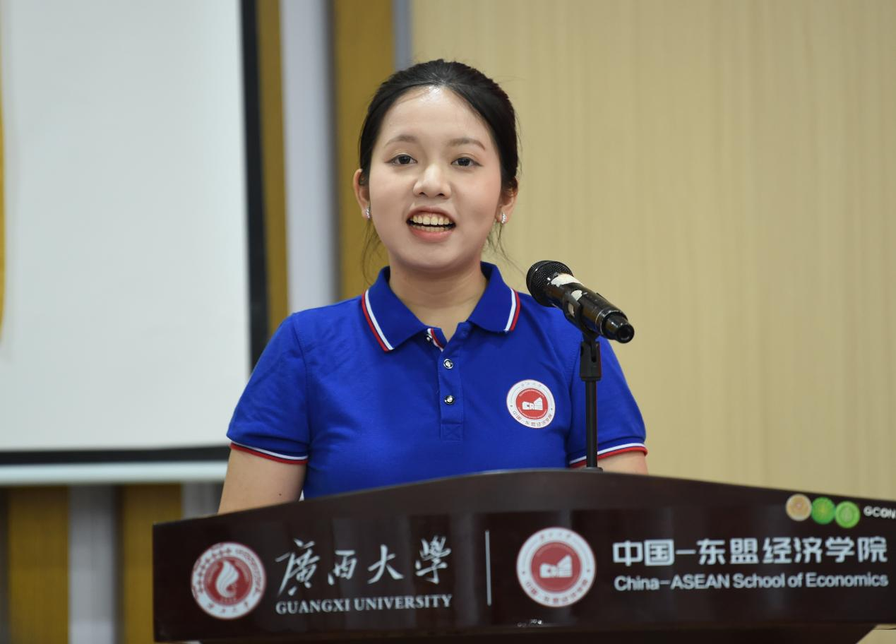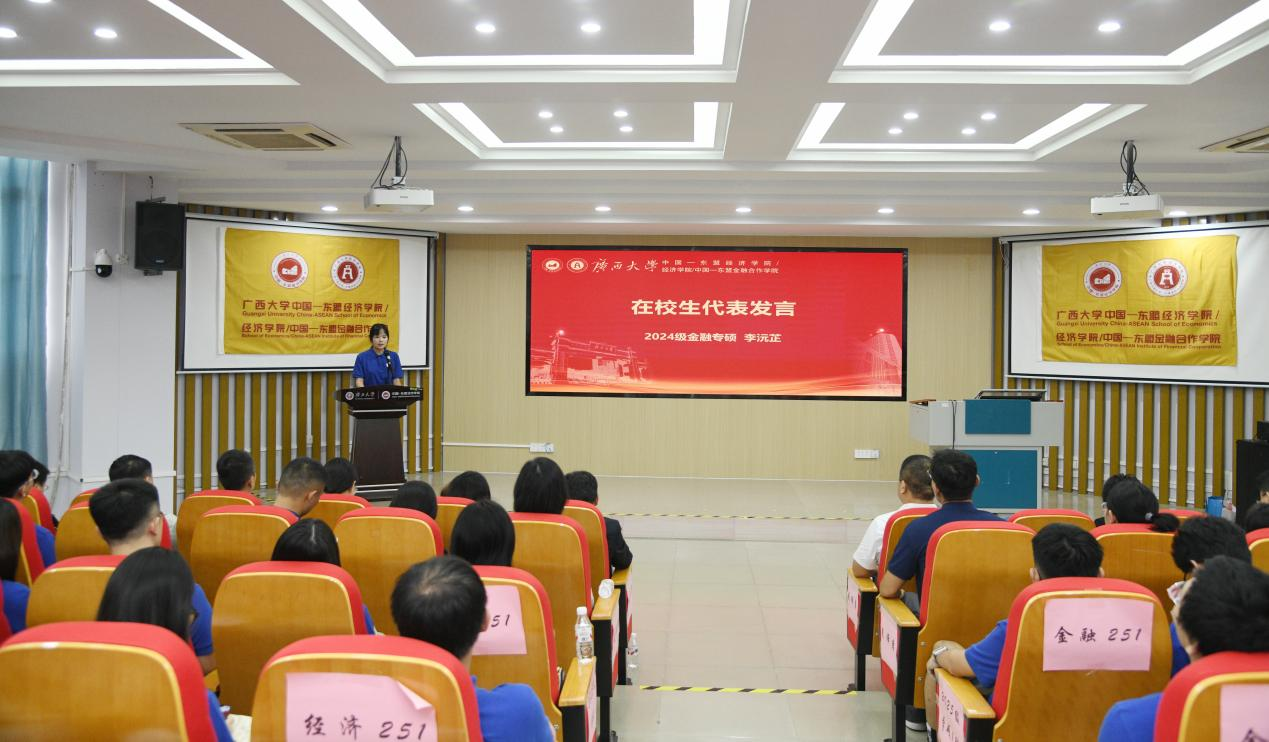 学院研究生会主席团成员、2024级金融专硕的李沅芷以“扎根、破界、坚守”为关键词,为新生们提出了三点建议:她鼓励新生深入中国—东盟合作一线,厚植家国情怀;善用国际化平台,拓展全球视野;保持热爱与信念,锤炼研究能力和职业品格。最后,她也祝愿新生们学有所成、青春无悔。