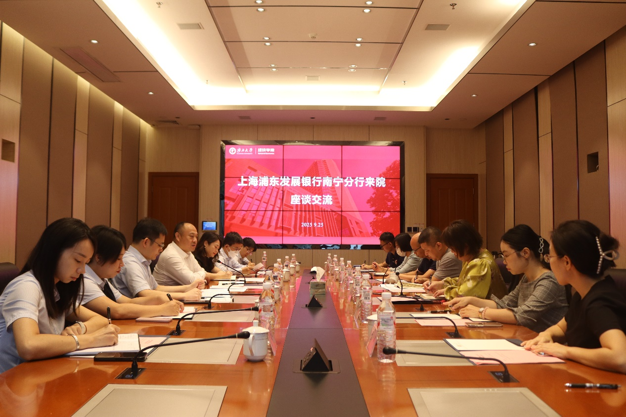 当日上午,双方在学院B208会议室举行交流座谈会。浦发银行南宁分行党委委员、副行长韩东勋率队,与学院党委常务副书记姜玮、党委副书记、纪委书记刘梦娟等院系领导及教师代表进行了深入务实的交流。