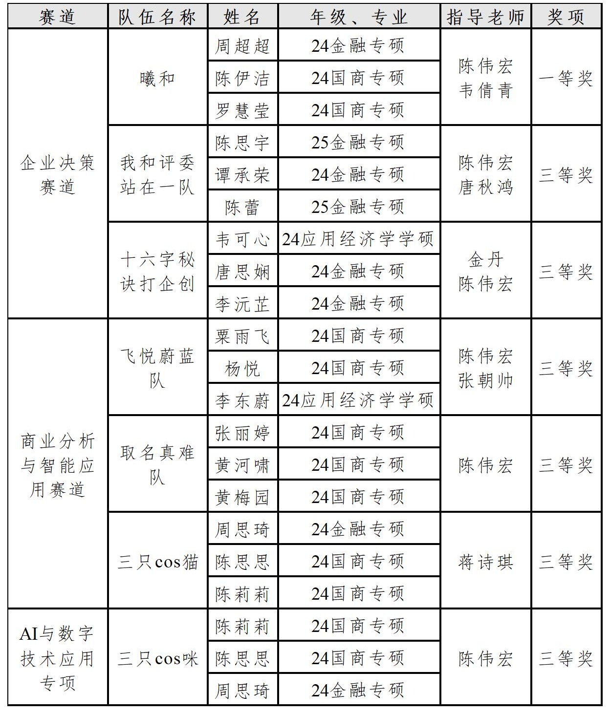 师生积极筹备,再创佳绩,在企创大赛中斩获多项大奖,包括在大赛“企业决策赛道”荣获全国一等奖1项,三等奖2项;“商业分析与智能应用赛道”荣获全国三等奖3项;“AI与数字技术应用专项赛道”荣获全国三等奖1项。此外,性吧