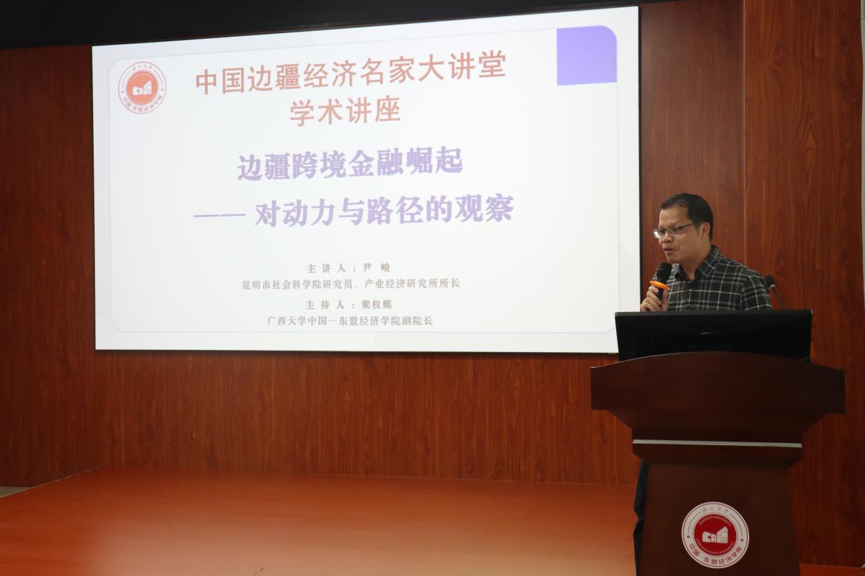 B101报告厅内座无虚席,“中国边疆经济名家大讲堂”如期开讲。本次讲座邀请到昆明市社会科学院研究员、产业经济研究所所长尹峻,围绕“边疆跨境金融崛起——动力与路径的观察”这一前沿课题展开分享。讲座由学院副院长梁权熙主持,学院九十余名师生参与。