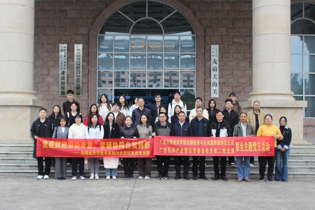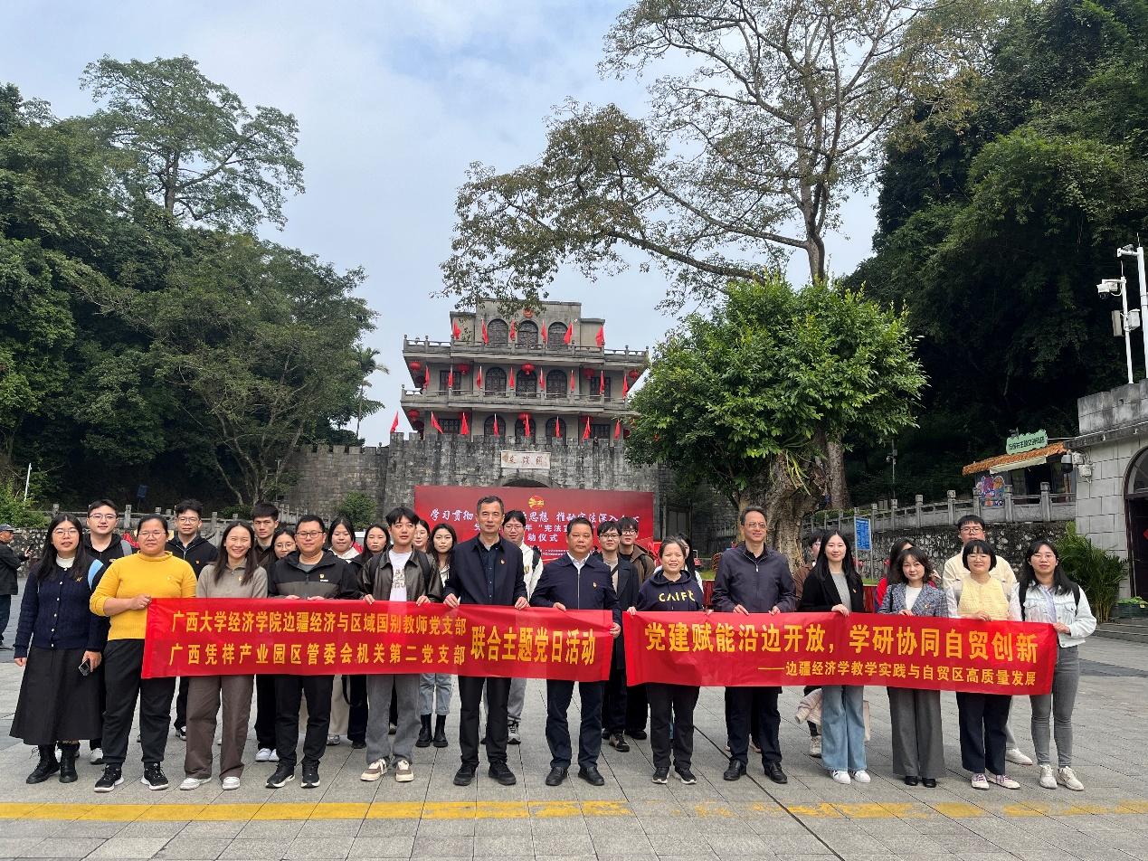 边疆经济与区域国别教师党支部(简称教师党支部)联合边疆经济学专业研究生导师、2024级和2025级硕士研究生20余人,赴广西凭祥产业园区与广西凭祥综合保税区、中国(广西)自由贸易试验区崇左片区管理委员会机关第二党支部(简称管委会机关第二党支部)开展“党建赋能沿边开放,学研协同自贸创新——边疆经济学教学实践与自贸区高质量发展”联合主题党日暨“导师面对面”活动。本次活动将红色教育、口岸调研、校地共建研讨与师生互动交流有机结合,进一步引导党员教师和边疆经济学专业师生厚植家国情怀、强化边疆意识、服务国家对外开放和中国—东盟经贸合作大局。