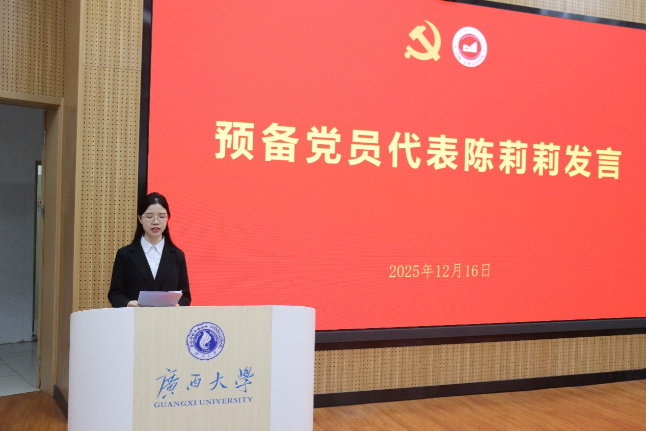 预备党员代表陈莉莉同志在发言中深情回顾了自己的入党初心与成长历程。她表示,将始终牢记党员身份,以实际行动践行“全心全意为人民服务”的宗旨,努力成为让党组织放心、让人民满意的合格党员。
