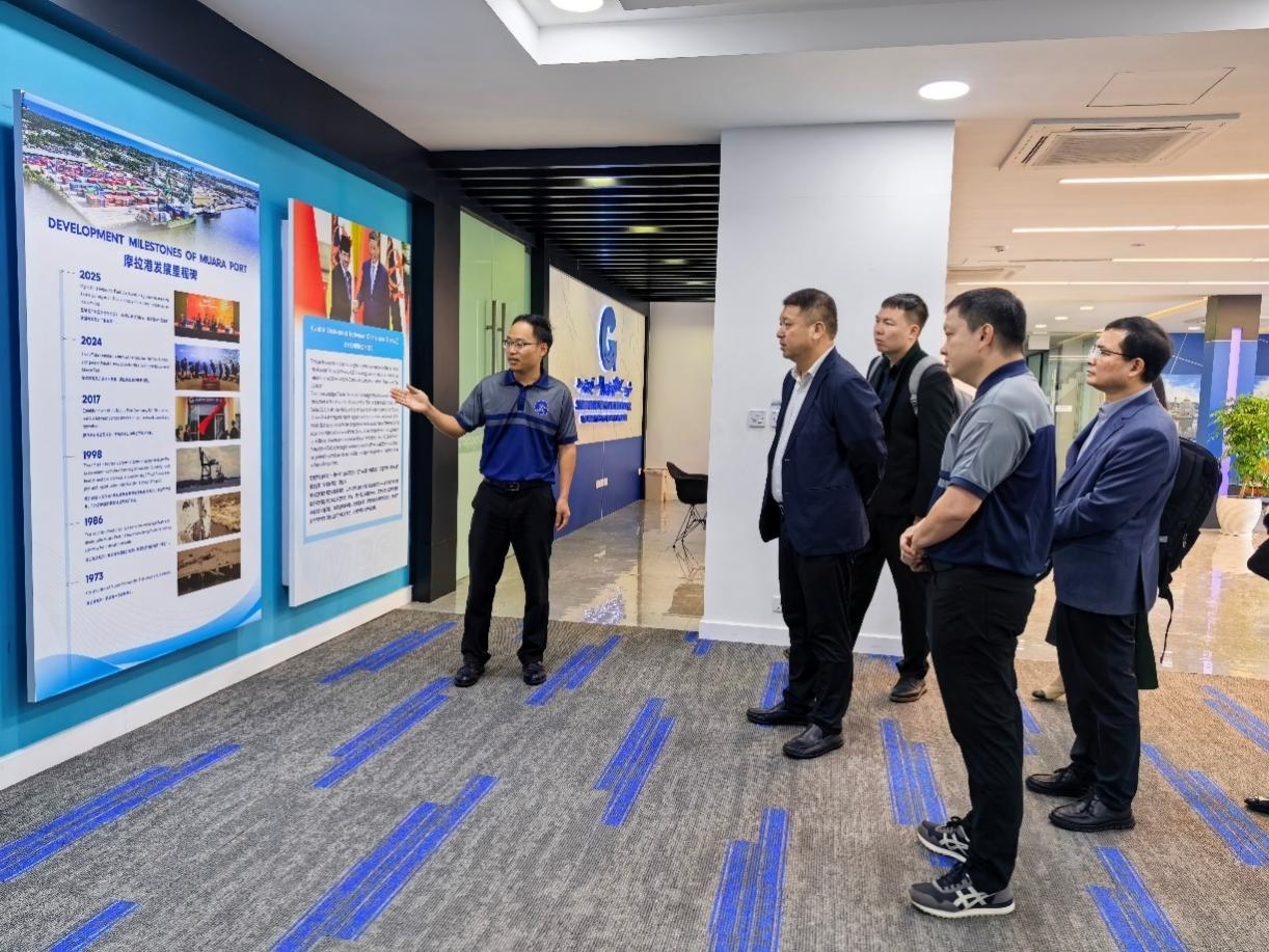 下午,调研团前往文莱摩拉港进行实地访问。北部湾控股(文莱)有限公司总经理吕国立、文莱摩拉港有限公司行政部经理傅晨棪、市场部经理李柱欢等陪同调研团参观。通过展厅翔实的图文资料,调研团深入了解港口的发展历程、战略定位、运营现状、临港产业规划以及向智能化升级的蓝图。展厅内关于人力资源培养与性吧的展示,也体现了港口的长远发展理念。随后,调研团乘车考察码头作业区,实地观摩了港口的繁忙作业景象。此次实地参访使调研团对文莱的核心港口与物流枢纽有了直观且深入的认识,为学院研究中国—东盟跨境物流与“广西—文莱经济走廊”建设提供了宝贵的实地参考。