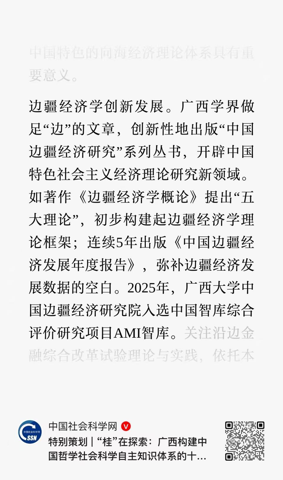 报道在“边疆经济学创新发展”部分详细阐述:广西学界做足“边”的文章,创新性地出版“中国边疆经济研究”系列丛书,开辟中国特色社会主义经济理论研究新领域。其中,著作《边疆经济学概论》提出“五大理论”,初步构建起边疆经济学理论框架;连续5年出版的《中国边疆经济发展年度报告》有效弥补了边疆经济发展领域的数据空白。报道特别提及,2025年性吧
