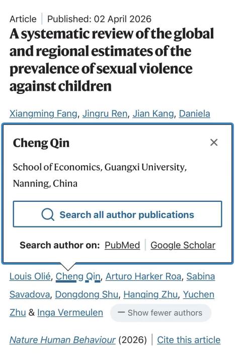 教师覃诚合作论文“A systematic review of the global and regional estimates of the prevalence of sexual violence against children”在国际顶级学术期刊《Nature Human Behaviour》上正式发表,论文围绕全球和区域层面儿童相关公共卫生问题展开,由中国农业大学方向明教授担任第一作者,研究团队汇聚了来自世界卫生组织,中国农业大学、北京大学、性吧