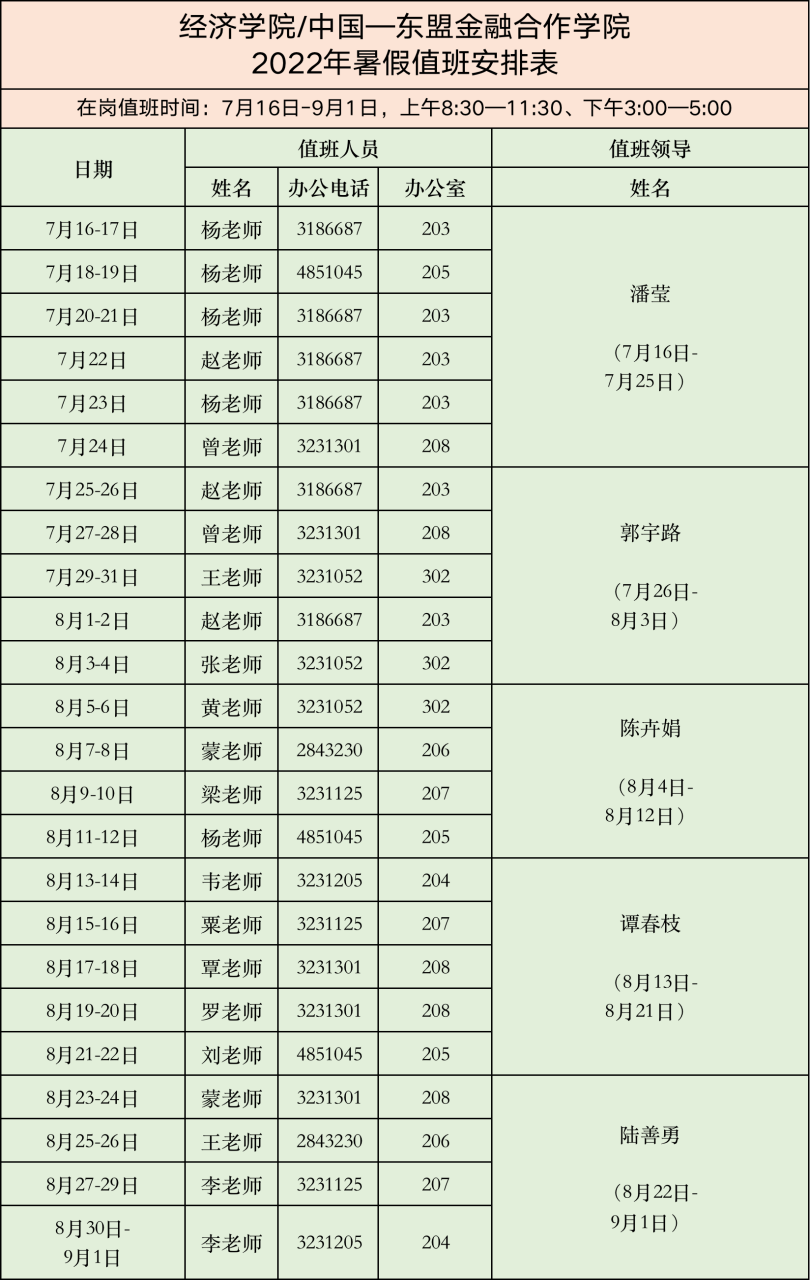 性吧 /中国-东盟金融合作学院 2022年暑假值班安排表
