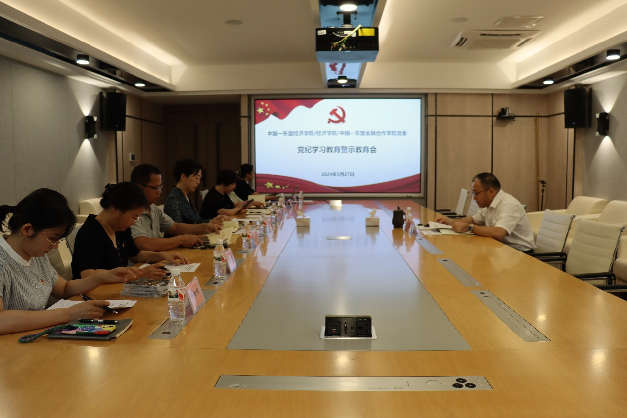 /中国-东盟金融合作学院党委在学院102会议室开展了党纪学习教育警示教育会。会议由学院党委常务副书记罗诚主持,学院党委领导班子成员、纪委委员、专职组织员及各教工支部书记参加会议。
